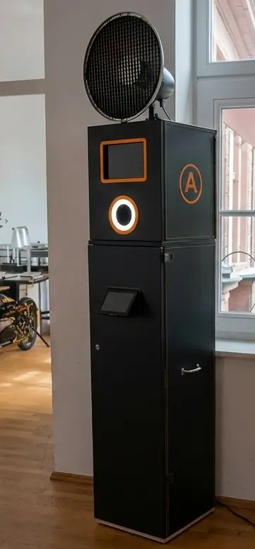 1. Die rustikale Schrank-Fotobox: Ein edles Design (jetzt auch in der eleganten Black Edition verfügbar) mit integriertem Beauty-Dish-Blitz und großem Monitor. Diese Variante ist ideal für schicke Säle und Hochzeiten im Vintage- oder Industrial-Stil.